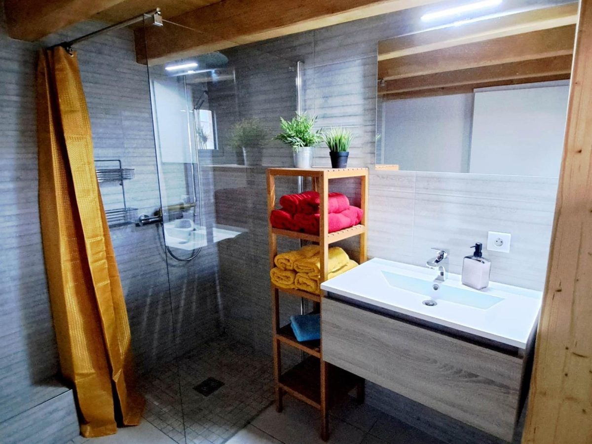La mezzanine en pin naturel abrite un lit Queen Size et offre un coin cosy surplombant le séjour. Sous la mezzanine se trouvent deux lits superposés ainsi qu’une salle de bain séparée avec douche à l’italienne.