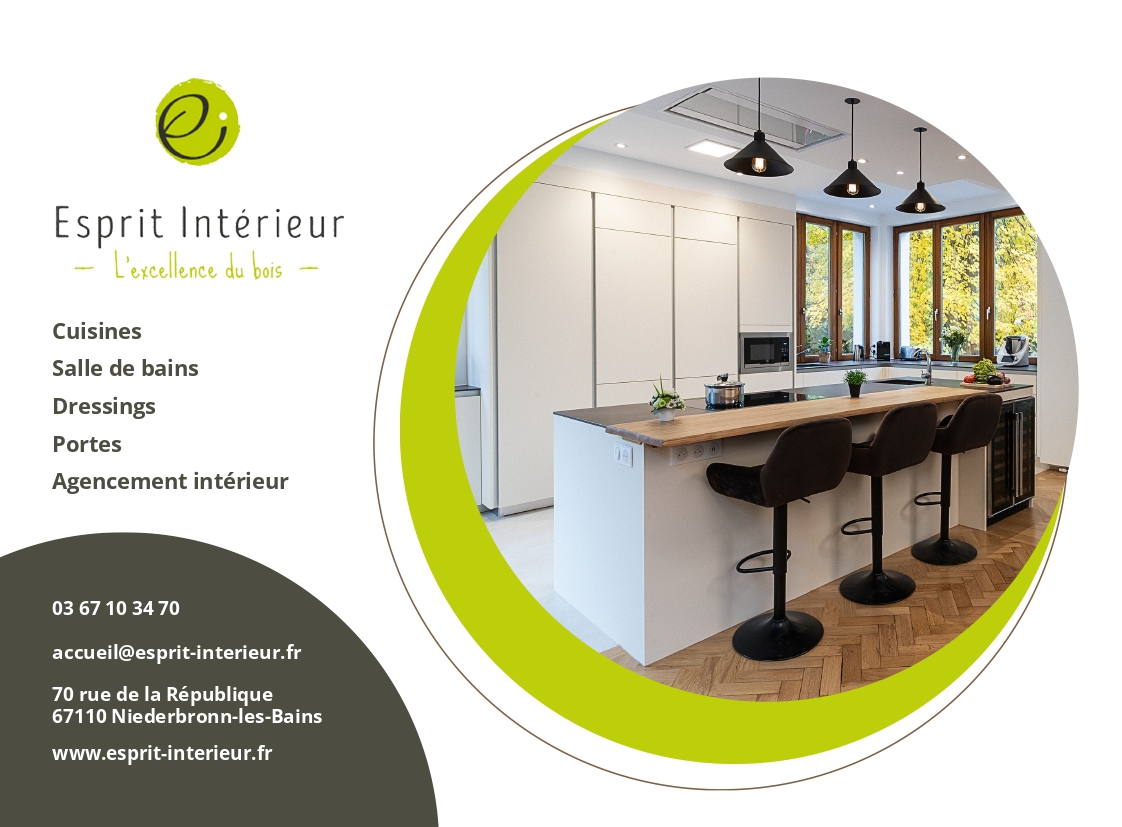 Esprit Intérieur est une entreprise familiale fondée par le maître ébéniste Sébastien Cromer et basée à Niederbronn-les-Bains. Vainqueur du premier prix du maillet d'or en 2004 et du prix de l'Odyssée des entrepreneurs en 2015, son savoir faire en fabrication, menuiserie, cuisinerie, mais également la fabrication de meubles sur mesure et l'utilisation de bois massif lui ont permis de monter son entreprise, et de transmettre ses connaissances à son équipe et sa famille. Découvrez leur travail raffiné grâce à la showroom de Niederbronn-les-Bains.