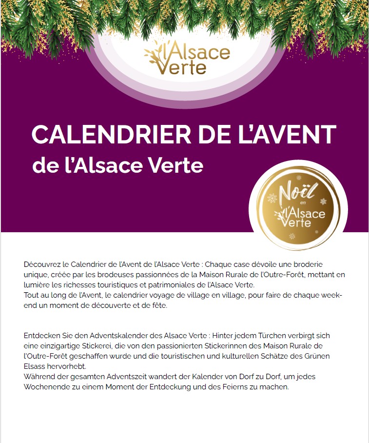 Durant le temps de l’Avent, dans une atmosphère pleine de féérie et de magie, venez découvrir Un calendrier de l’Avent géant pour découvrir les trésors de l’Alsace Verte